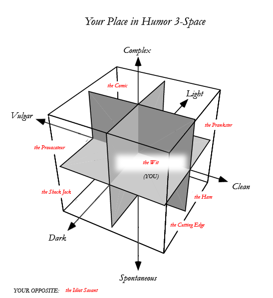 the Wit (65% dark, 30% spontaneous, 33% vulgar) | your humor style: CLEAN | COMPLEX | DARK